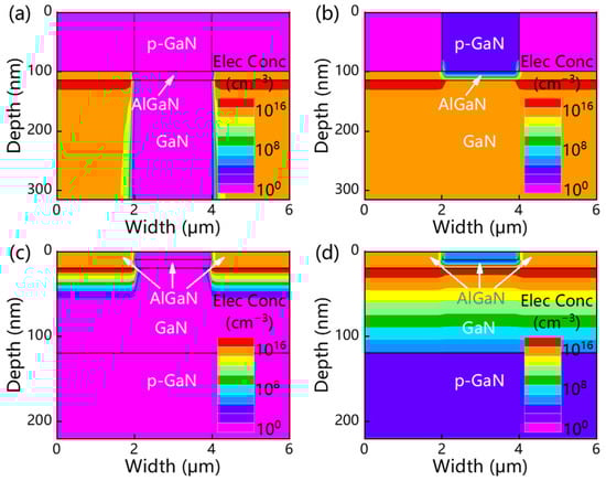 Simulated electron concentration distributions of the conventional device with a capped p-GaN gate under (a) dark and (b) weak UV illumination conditions, and the novel device with a buried p-GaN gate under (c) dark and (d) weak UV illumination conditions.