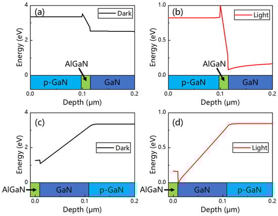 Energy band diagrams of the conventional device with a capped p-GaN gate under (a) dark and (b) weak UV illumination conditions, and the novel device with a buried p-GaN gate under (c) dark and (d) weak UV illumination conditions.
