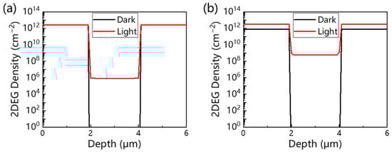 The 2DEG densities at the AlGaN/GaN heterojunction interfaces of the PTs under dark and weak UV illumination conditions at zero bias are illustrated in Figure 4. For the conventional device, the 2DEG located beneath the capped p-GaN gate is completely depleted in the dark, as shown in Figure 4a. Upon UV illumination, a slight restoration of the 2DEG density is observed, however, it remains very low, corresponding to limited photocurrent generation and poor sensitivity. For the novel device, the 2DEG in the active region is also depleted by the buried p-GaN gate in the dark, as shown in Figure 4b. However, in the non-active region, where the AlGaN barrier is thicker, a considerable 2DEG density is preserved, ensuring that the buried p-GaN layer does not interfere with Ohmic contact formation. Upon UV illumination, the 2DEG density in the active region is restored to over 1 × 108 cm−2, which corresponds to a high photocurrent and enhanced sensitivity, indicating that the conductive channel of the novel device can be effectively reactivated by relatively weak UV illumination. These results confirm the superior weak-light detection capability of the novel structure.