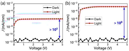 The J–V characteristics of the conventional and novel PTs are presented in Figure 5a and Figure 5b, respectively. For both devices, the dark currents are suppressed to below 1 × 10−11 mA/mm at a drain voltage of 5 V, indicating complete depletion of the conduction channels. Compared with the previously reported dark currents [25], which are limited by the detection limit of the measurement system, the simulated dark current is slightly lower. Under UV illumination, the novel device exhibits a high photocurrent exceeding 1 × 10−3 mA/mm and a large PDCR greater than 108 at 5 V, which are three orders of magnitude higher than those of the conventional device. These findings are consistent with the simulated conduction band diagrams and 2DEG distributions shown in Figure 3 and Figure 4, further confirming the superior weak-light sensitivity and turn-on capability of the novel structure.