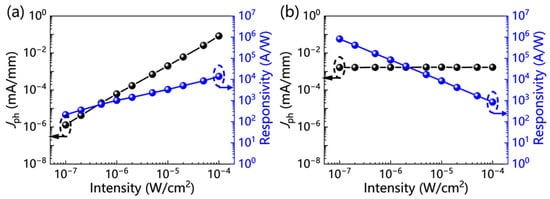 Photocurrents and responsivities of the (a) conventional and (b) novel devices under UV illumination at light intensities ranging from 100 nW/cm2 to 100 μW/cm2 at a drain voltage of 5 V.