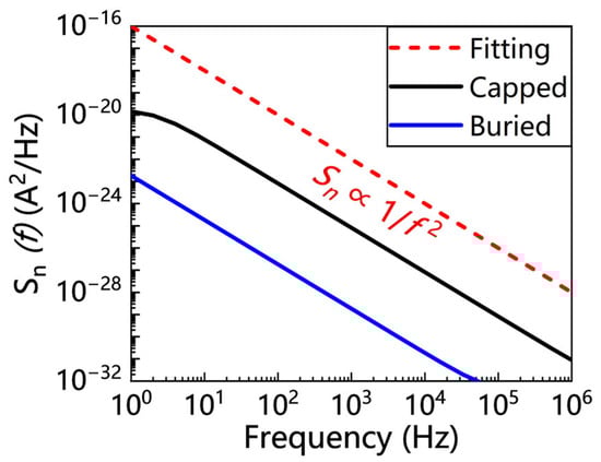 Consistent with the experimental results previously reported [25], the simulated Sn spectra for both device structures decrease linearly on a logarithmic scale, as indicated by the red fitting curve in Figure 7. The observed linear dependence of Sn on frequency confirms that the dominant source of the low-frequency noise is trap-assisted 1/f (flicker) noise. The total noise power ⟨in⟩2 can be calculated by integrating Sn over the frequency range as follows: