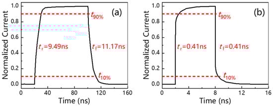 Response time is another critical figure of merit for PDs as it determines the device’s suitability for specific applications. It is defined by the speed at which the device reacts to abrupt changes in the incident signal. The normalized transient responses of the PTs at a drain voltage of 5 V were simulated using Silvaco Atlas and are presented in Figure 9. For the conventional device, the rise time—measured as the time taken for the current to increase from 10% to 90% of its peak value—is 9.49 ns, as shown in Figure 9a. Similarly, the fall time—defined as the time required for the current to decrease from 90% to 10% of its peak value—is 11.17 ns. Compared with the previously measured response time on the microsecond scale [25], the simulation results neglect the impact of etching-induced damage. This, in turn, indicates that etching damage should be minimized as much as possible during device fabrication. In contrast, the novel device demonstrates significantly faster rise and fall times of 0.41 ns each, as illustrated in Figure 9b. This remarkable improvement is attributed to the much shorter retraction distance of the depletion region during switching operations. The enhanced temporal response substantially broadens the application prospects of the novel device in high-speed UV communication, real-time sensing, and advanced optoelectronic systems.