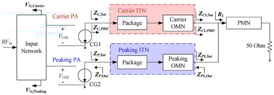 The architecture of a conventional DPA is illustrated in Figure 1, which comprises a Class-AB carrier amplifier and a Class-C peaking amplifier. is the load impedance at the combining point. To enhance the performance of a DPA, it is essential to select the optimal load impedance. Post-matching network (PMN) is employed to convert 50 to across the operating band. Transistors are divided into their package and current generator (CG). The impedance transformation network (ITN) is formed by an output matching network (OMN) and package. The output architecture of a conventional DPA exhibits limited flexibility, as it can only achieve impedance transformation in one single mode. Specifically, at saturation, both of the carrier and peaking ITN need to transform to , where and are the load impedance at the combining point and the optimal load impedance at the CG plane, respectively. In the PBO state, the carrier ITN needs to transform to , while the peaking branch remains inactive, requiring its output impedance to be infinite. By satisfying the aforementioned impedance transformations, the desired Doherty characteristics can be achieved.