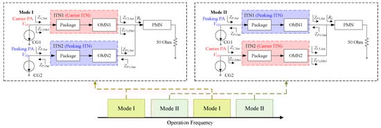 After the gate biases are swapped, the DPA switches into Mode II, where the CG1 becomes the peaking PA and the CG2 becomes the carrier PA. It should be noted that, although ITN1 and ITN2 in the DPA circuit structure remain unchanged, their functions have been swapped. Specifically, ITN1 now functions as the peaking ITN, while ITN2 functions as the carrier ITN. Due to the different frequency responses of the ITNs in different operating modes, through appropriate design, the DPA can achieve dual-band operation in the same mode, as shown in Figure 2. As a result, the combined operating band of the DPA will be expanded.