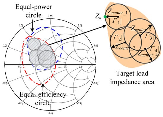 To improve the utilization of the optimum load impedance region, this paper employs multiple impedance constraint circles to describe the region, as shown in Figure 3. For each impedance constraint circle, represents its radius, which can be calculated by (1):