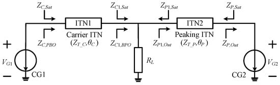 The bandwidth of the DPA is significantly influenced by the phase delays of the carrier and peaking ITNs. The schematic of the ideal load modulation network of the DPA is shown in Figure 4. Table A1 in Appendix A summarizes the variable symbols and their definitions in the process of phase delay determination. To achieve the desired impedance transformation, the phase delay of the carrier ITN and the phase delay of the peaking ITN can be expressed by (2) and (3), respectively: