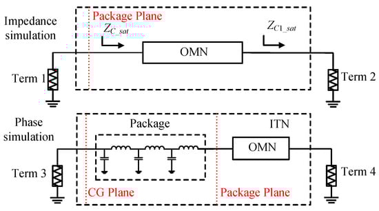 A schematic for impedance and phase simulation is illustrated in Figure 5, where the phase delay at the CG plane and the impedance at the package plane can be obtained simultaneously. Through the aforementioned analysis of the required impedance and phase delay for the dual-mode multi-band DPA, this paper proposes a design approach based on impedance-and-phase constrained optimization. This approach can effectively reduce the complexity associated with the design of dual-mode multi-band DPA. Table A1 summarizes the variable symbols and their definitions for impedance-and-phase constrained optimization.