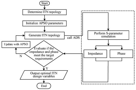In order to achieve better performance, various optimization methods have been widely applied to numerous engineering problems [46,47,48,49,50,51,52,53,54]. Therefore, to further enhance both the global optimization efficiency of complex systems and the dynamic adaptability of algorithms, the adaptive particle swarm optimization (APSO) is proposed. The flow chart of the above optimization design process is illustrated in Figure 6. Initially, the ITN topology is determined, and then, the APSO parameters, such as population size, number of iterations, and initial population, are initialized, in which each particle in the population corresponds to the design variables of the ITN (i.e., the width and length of microstrip lines). Subsequently, each particle is transferred to an Advanced Design System (ADS) through an interface program to generate the ITN topology, and S-parameter simulation is performed to obtain the impedance and phase corresponding to the generated ITN. Following this, the simulated results are transferred to MATLAB 2022 through the interface program, after which they are evaluated using the proposed impedance-and-phase optimization objective function. The iteration of APSO continues until the optimization objective is satisfied.