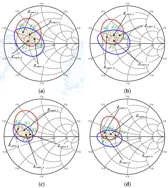 Coverage of the target impedance region with impedance constraint circles at four design frequencies: (a) 2.0, (b) 2.8, (c) 2.5, and (d) 3.3 GHz.