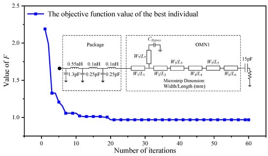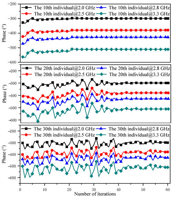 Using the impedance-and-phase constrained optimization design described in Section 2.4, multiple optimization iterations are carried out to guarantee that ITN1 satisfies the desired impedance and phase delay requirements at saturation and in the PBO state. The ITN1 topology to be optimized is shown in Figure 8, together with the objective function values of the best individual at each iteration to illustrate the optimization process. As the iterations proceed, the objective function value converges and stabilizes after approximately 20 iterations, indicating that these design variables successfully meet the design target. Additionally, the ITN topology generated by the set of variables in the best individual which satisfies the requirements for impedance matching and phase delay has been obtained, and the values of these variables are presented in Table 4. The phase delay variation curves of the 10th, 30th, and 50th individuals at the four operating frequencies (2.0, 2.5, 2.8, and 3.3 GHz) are shown in Figure 9, indicating that the phase delays of the selected individuals at the four target frequencies fulfill the phase delay requirements for ITN1 in the dual-mode multi-band DPA, which confirms the consistency and validity of the optimization across the population.