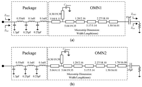 The designed ITN1 structure is presented in Figure 10a. Since ITN2 and ITN1 in the reciprocal-bias dual-mode multi-band DPA have a similar structure, ITN2 is designed by adding a phase compensation line after ITN1. The corresponding schematic is shown in Figure 10b.