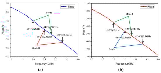 After the impedance-and-phase constrained optimization design is completed, Figure 11 depicts the resulting phase delays of ITN1 and ITN2 at their respective design operating frequencies. When the reciprocal-bias dual-mode multi-band DPA operates in Mode I, ITN1 functions as the carrier ITN. At 2.0 and 2.8 GHz, its phase delays are and , respectively. Meanwhile, ITN2 acts as the peaking ITN, with phase delays of and at 2.0 and 2.8 GHz, correspondingly. Upon swapping the gate bias, the DPA switches to Mode II. In this mode, ITN2 serves as the carrier ITN, presenting phase delays of and at 2.5 and 3.3 GHz, respectively. ITN1 functions as the peaking ITN, with phase delays of and at 2.5 and 3.3 GHz, respectively. These results are consistent with the theoretical analysis.