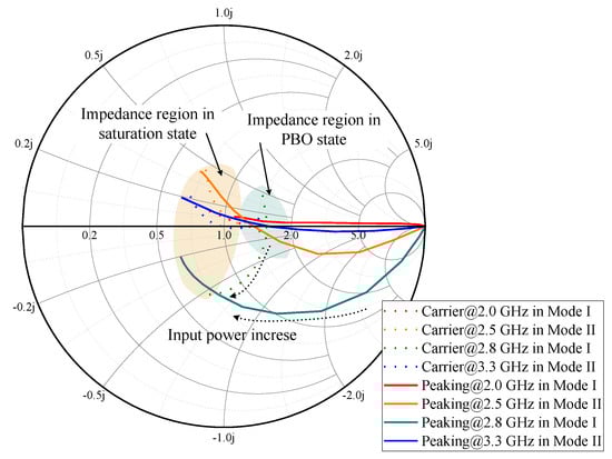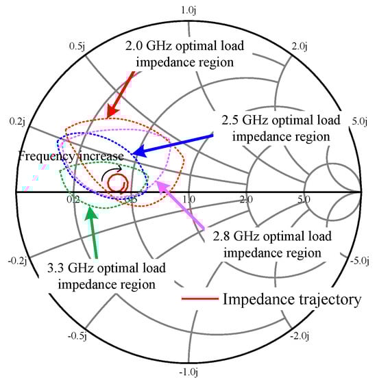 The optimized trajectory achieved by the optimized OMN and the optimal impedance regions at four frequencies are shown in Figure 12. The impedance at 2.0 and 2.8 GHz in Mode I, as well as at 2.5 and 3.3 GHz in Mode II, is all located within the optimum load impedance region. This confirms that the design meets the expected objectives.