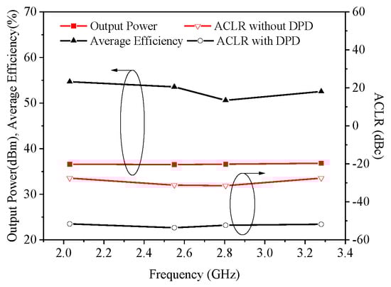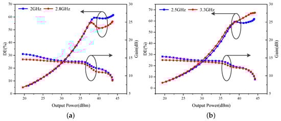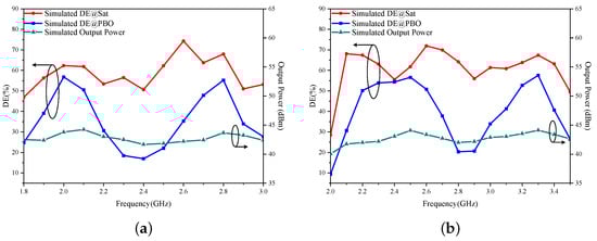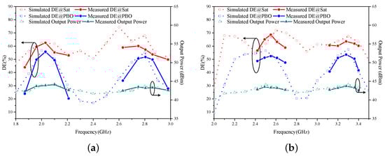 The performance of the dual-mode multi-band DPA is simulated under different operating modes, and the results are presented in Figure 13. In Mode I, the designed DPA functions within the frequency bands of 1.96–2.10 and 2.75–2.86 GHz. At saturation, its drain efficiencies (DEs) are 57.0–62.5% and 52.4–57.4%, respectively. The 6 dB PBO DEs span from 51.4 to 55.9% and 52.4 to 54.0%.