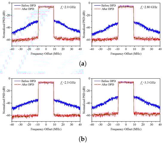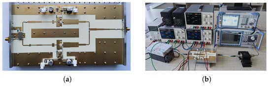 To further validate the design, the dual-mode multi-band DPA was fabricated. A photograph of the DPA is shown in Figure 16a. To evaluate its performance, the fabricated DPA was measured with continuous wave and modulated signals. The measurement was carried out across the frequency bands of 1.96–2.10 GHz and 2.75–2.86 GHz for Mode I, and 2.49–2.61 GHz and 3.20–3.36 GHz for Mode II, with the setup presented in Figure 16b. The drain bias voltages of the carrier and peaking PAs are both 28 V. The gate bias voltage of the carrier PA is −3 V, and that of the peaking PA is −6 V. For the selected transistor, the DC quiescent current () of the carrier PA is 0.1 A.