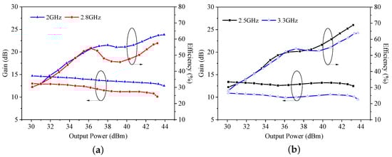 Measured efficiency and gain versus output power (a) at 2.0 and 2.8 GHz in Mode I and (b) at 2.5 and 3.3 GHz in Mode II.