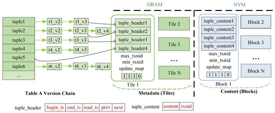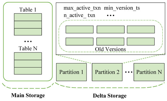 Delta storage separates the latest versions and old versions, storing them in main storage and version storage, respectively. When a tuple is modified, it is first copied and written to version storage, followed by an in-place update in the main storage [35,36,37]. Time-travel storage is similar to delta storage in that the latest versions and old versions are stored in main storage and version storage, respectively. The difference is that in version storage, old versions are arranged in an append-only manner, thus having a chronological order [38,39,40].