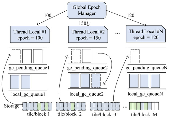 The entire internal structure of the GC is shown in Figure 4. The global epoch manager maintains a global timer that increments by 1 every 40 ms. Each thread obtains the current epoch from the global epoch manager when starting a new transaction, referred to as the local_epoch. The local_epoch_min represents the minimum value of all current local_epochs, and no txn_id will be earlier than the time represented by local_epoch_min. Each thread manages a gc_pending_queue and a local_gc_queue, with the former holding the logical addresses of tiles/blocks that will become obsolete and the latter holding the logical addresses of obsolete tiles/blocks. The local_gc_queue_frozen contains logical addresses of tiles/blocks ready for collection.