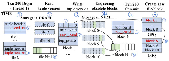 Obsolete Block Cleanup and Reclamation. In this phase, after Txn 200 is committed, the transaction thread checks its maintained local_gc_queue. If the local_gc_queue is full, the thread enters GC mode. The address of the local_gc_queue is assigned to thread.local_gc_queue_frozen, and a new queue is created with its address assigned to local_gc_queue. Subsequently, for each block in local_gc_queue_frozen, the latest versions are quickly retrieved based on the offsets in the update_map (a value of 0 in the update_map indicates that the corresponding tuple version has never been modified) and are inserted into the new (block N + 1) (step 6). Finally, all DRAM and NVM spaces corresponding to the tiles/blocks in local_gc_queue_frozen are released.