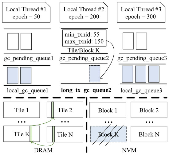 The complete algorithm for obsolete tile and block collecting, as well as handling long transactions, is detailed in Algorithm 1. Initially, if the percentage of bits set to 1 in the update_map exceeds , the current block is placed in the local thread’s pre-recycling queue thread.gc_pending_queue (line 4). The algorithm then traverses thread.gc_pending_queue, and for each block, if the earliest active transaction is later than the most recent write transaction in the block (local_epoch_min is greater than block.max_txnid), the block is added to thread.local_gc_queue (line 9). If the earliest active transaction is earlier than the first write transaction in the block (local_epoch_min is less than block.min_txnid), further checks are performed: If the second earliest active transaction is later than the most recent write transaction in the block (local_epoch_sec_min is greater than block.max_txnid), it indicates the presence of a long transaction (the transaction corresponding to local_epoch_min). The block is then added to the long transaction recycling queue thread.long_tx_gc_queue, and the transaction is marked as a long transaction (lines 15, 16). If local_epoch_sec_min is less than block.min_txnid, the process iterates to the third smallest value, and so on. When a long transaction is identified, the block is placed in thread.long_tx_gc_queue, and the transaction is marked as a long transaction (lines 12 to 19).