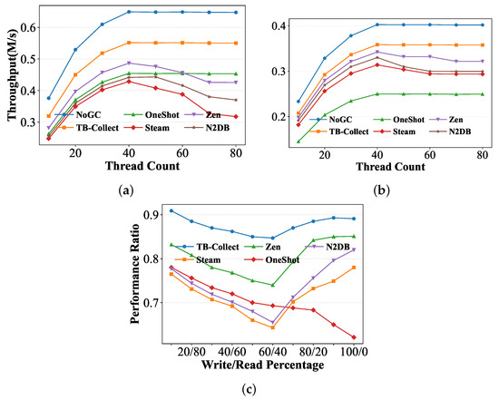 Scalability. In this experiment, we test the throughput of each system as the thread count varies using real NVM hardware (described in Section 5.1). As shown in Figure 15a, it can be observed that with the increase in the number of concurrent threads, My_TB-Collect consistently delivers the best throughput among all systems with GC enabled. Furthermore, at 40 threads, it reaches 88% of the My_NoGC throughput. When the thread count exceeds the number of logical CPU cores, the throughput of all systems decreases and eventually stabilizes. During the entire process, My_TB-Collect maintains a performance advantage, achieving throughput approximately 1.23–1.58× higher than other systems.