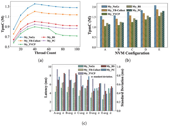 Throughput. In this experiment, we set the number of threads to 40 and evaluate the system throughput with different NVM configurations. As shown in Figure 15b, we can see that when the NVM cache line size decreases from 256 B to 128 B, the changes in My_TB-Collect, My_TVCP, and My_BS are not significant, with only a 3%–5% increase. My_PC shows the largest improvement, about 10%, because as the NVM cache line size decreases, the number of write amplification operations also decreases. My_TB-Collect has the fewest write amplification operations among all systems, so the performance improvement is not very noticeable. On the other hand, My_PC, due to using in-place version storage, has the largest write amplification operations, resulting in the largest performance improvement. With the continuous increase in NVM read/write bandwidth, the performance of all systems also improves, and My_TB-Collect still performs the best among the systems. When the NVM read/write bandwidth is fully aligned with DRAM and the granularity is 64 B, which means NVM can match the performance of DRAM, we observe significant performance improvements in My_TVCP, My_BS, and My_PC; all of the GC approaches in these systems are designed for DRAM. Among them, My_PC shows the greatest improvement, with about 95% of My_TB-Collect’s performance. Nevertheless, My_TB-Collect still maintains a certain performance advantage. The reason is that My_TVCP and My_BS require traversing version chains during GC, which leads to performance degradation, while TB-Collect does not. Moreover, compared to My_PC, My_TB-Collect has a faster GC frequency, and its version chain length remains low (as shown in Figure 14), resulting in higher access efficiency for old versions compared to My_PC.
