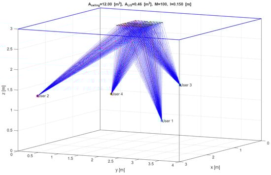 LIS scenario considered in the simulations with four panels on the ceiling (only direct paths are plotted).
