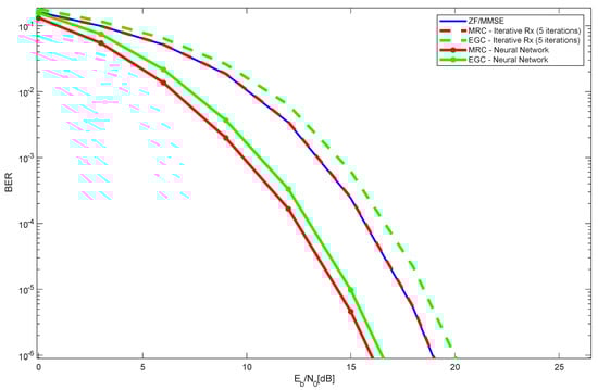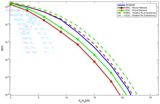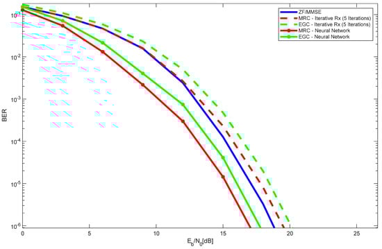 Figure 7 shows the performance results of the 4 × 400 LIS configuration, with 16 users, with an iterative receiver and with a neural network, for both MRC and EGC. The results for ZF/MMSE are also plotted. Similar to the observations in Figure 4 (with two users), Figure 7 demonstrates that, for a scenario with 16 users and the given LIS configuration, the MRC neural network receiver achieves the best overall performance. As expected, the performance of ZF/MMSE stays within that of MRC/EGC iterative receivers and MRC/EGC neural network receivers.