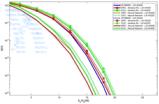 Figure 6 shows the performances of the following two LIS configurations: 4 × 400 and 4 × 225. Two users were considered in the simulations. As expected, the results obtained with 4 × 400 LIS configuration were always better than those obtained with 4 × 225 for all different receiver types. Moreover, it is observed that the best overall performance was obtained with the 4 × 400 LIS configuration and MRC neural receiver.