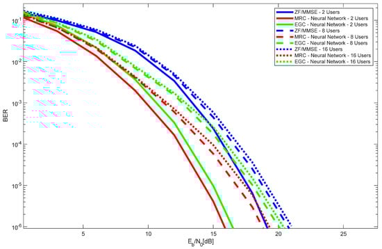 Figure 8 presents the performance results for the 4 × 4004 LIS configuration with varying numbers of users (2, 8, and 16), using both iterative and neural-network-based receivers, for MRC and EGC schemes. The results for ZF and MMSE receivers are also included. As expected, the performance declines as the number of users increases. However, the degradation observed when increasing from 8 to 16 users is minimal. This occurs because the LIS is able to mitigate interference very efficiently. The receiver that achieves the best overall performance, regardless of the number of users, is the MRC with the neural network receiver, followed by EGC.