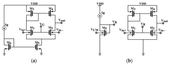 The first solution shown in Figure 1a utilizes transistors M1-M2, forming the BD differential pair and M5 as tail current source. Hence, it follows the classical approach, used in gate-driven topologies, with the tail current source that accurately sets the quiescent current of the input stage. Thanks to this, a high CMRR is achieved by reducing the effects of common mode disturbances on the output voltage, but it comes at the expense of the minimum supply voltage that must accommodate 2 VDS + VGS, as can be easily found by following the path from VDD to ground through M3 (that requires one VGS) and M1 and M5 (that require one VDS each). An additional biasing voltage VG is also needed and a discussion on its influence on gmb is found in [34]. Note also that this approach leads to a true differential pair resulting in an equal and opposite current change in the pair (iD1 and iD2) even when single input (e.g., vin+) is applied while the other input is kept at a constant voltage. Finally, the fact that the maximum sinking and sourcing output current is constant and limited to [(W/L)5/(W/L)6]IB dictates that only class A operation is possible. Regarding the small signal differential transconductance, Gmd, and common-mode transconductance, Gmc, we have