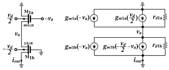 Figure 2b shows an improved version, originally proposed in [48], that utilizes M1a and M2a as cross-connected active loads degenerating the sources of M1b and M2b, respectively. The solution was then implemented in [49] utilizing the self-cascode current mirror M3a–M4b. The minimum supply voltage is 4VDS. Due to the positive feedback provided, the degeneration boosts the overall transconductance. We can derive the following equation for the equivalent differential transconductance, Gmd, using the small-signal equivalent model depicted in Figure 3:
