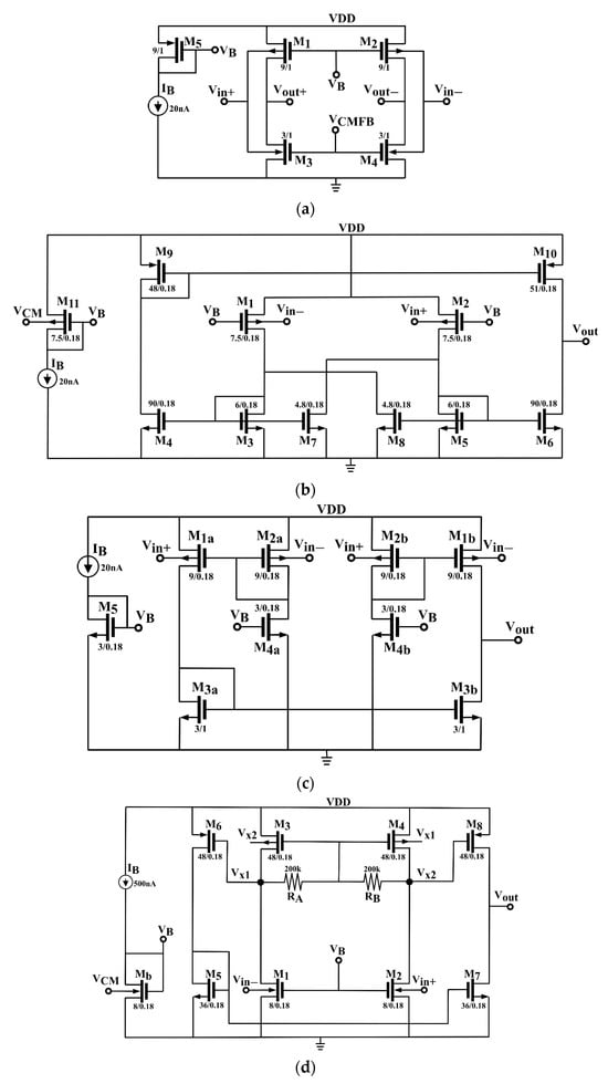 The second category of circuits studied in this review comprises class-A tail-less input stages. Four representative solutions have been selected and are illustrated in Figure 4a–d. Figure 4a, ref. [52], shows the simplest tail-less pseudo-differential input stage which exploits the bulk terminals of both p-channel (M1–M2) and n-channel (M3–M4) transistor couples. M1 and M2 are biased through VB. Due to the fully differential output, the gate voltage of M3 and M4 is driven by a common-mode feedback voltage which also increases CMRR. The common-mode feedback circuit can be simply implemented using two large resistors connected between the gate and drain of M3 and M4, as shown in Figure 4d. More advanced solutions utilize an auxiliary error amplifier, with a specific implementation detailed in reference [52]. The differential transconductance (single-ended) is simply