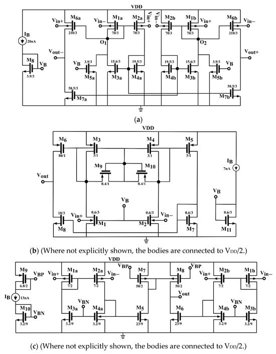The last topology examined in this category shown in Figure 5c utilizes two matched transconductor cells, M1a–M4a and M1b–M4b, similar to those in Figure 5a with the only difference that M4a,4b are diode-connected from body to drain (and not, as usual, from gate to the drain) [58]. The output resistance, ro1,2, of these input cells is equal to