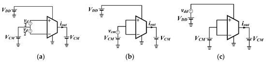 Test bench to evaluate equivalent transconductances: (a) differential Gmd, (b) common-mode Gmcm, and (c) from power supply Gmdd. VCM = VDD/2 is set.