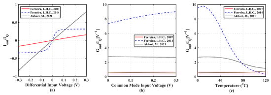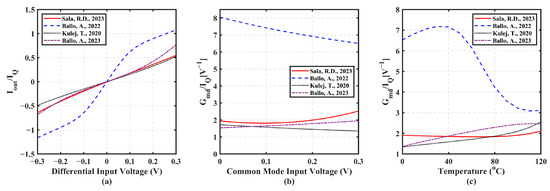 Finally, circuit sensitivity to temperature was assessed by plotting in Figure 7c the value of Gmd/IQ as a function of T in °C. VCM = VDD/2 was again set. Circuits in [49] shows the highest sensitivity to temperature with the largest percentual variations over the 0 to 120 °C range considered. Conversely, circuit in [47] shows the minimum variation with temperature.