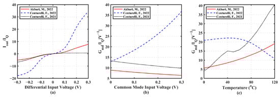 Figure 9 is related to the second set of tail-less BD input stages, demonstrating their class AB behavior because Iout/IQ values greater than the unity are achieved. Compared to class A solutions, a high transconductance is also attained. Specifically, the circuit in [58] operates only for negative vd. This limitation arises from the BD current mirror M7–M8, seen in Figure 5c, where increased input current beyond the standby value raises the input voltage, driving M7 out of saturation. The largest Iout/IQ ratio is achieved by [57]. However, Figure 9b shows that all topologies exhibit varying transconductance with VCM, with [57] displaying the most significant variation. Figure 9c shows that [58] has the highest sensitivity to temperature.