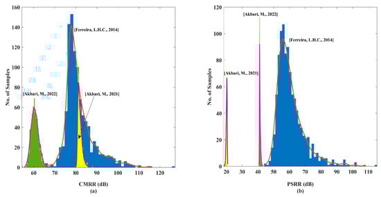 Statistical distribution of (a) CMRR and (b) PSRR magnitude due to mismatches (after 1000 Monte Carlo simulations) for three selected exemplifying cases [49,50,56].