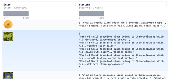 As shown in Table 1, the dataset used in this study is composed of three distinct subsets that cover a wide range of agricultural applications: CNU Weeds (weeds) [35], Surface Subtle Apple Defects (apples) [19,36], and CNU Pear Disease (pears). These subsets are designed to evaluate the model’s capability in multimodal tasks, including classification and retrieval across varying levels of granularity and complexity.