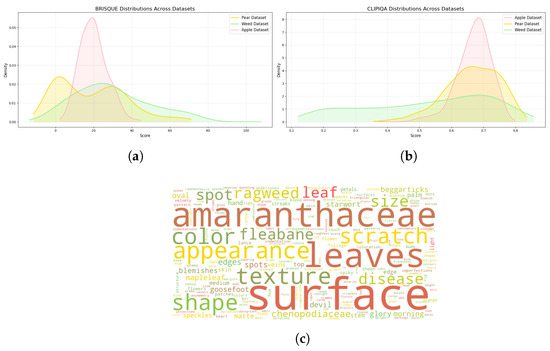 Image quality assessment: the pear dataset shows better image quality, with low BRISQUE scores (a) and high CLIPIQA scores (b). In comparison, the weed dataset has a wide range of scores, showing varied image quality. The apple dataset, on the other hand, has less variation in scores, indicating more uniform image quality. Additionally, the word cloud (c) demonstrates that image captions describe textures and appearances of the object.