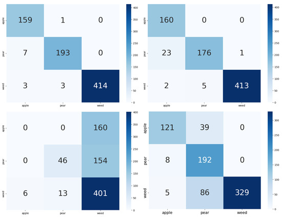 Confusion matrix of zero-shot prediction with coarse captions (weed, apple, and pear) from CLIP (tl), CoCa (tr), BLIP (bl) and ALIGN (br) models.