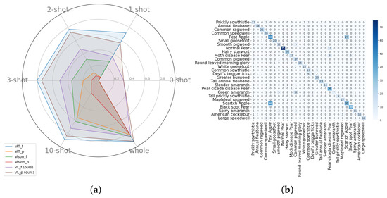 Table 3 show that when fine-tuning only the projection head, the VLM significantly outperforms vision-only models across all shot settings. Notably, the vision–language (VLp) model achieves 72.82% accuracy with just 2 shots, whereas ViT requires at least 10 shots to reach 56.28%, and the CLIP vision encoder (Vp) needs the entire dataset to reach 81.54%. This advantage likely stems from the text encoder in vision–language models, which enhances fine-grained class differentiation through captions. For direct comparison, the CLIP vision–language model consistently outperforms its vision-only counterpart across all settings, whether fine-tuning the full model or just the projection head. However, the best overall performance comes from full fine-tuning of the ViT model, excelling in both few-shot and full-dataset settings. This can be attributed to ViT’s pretraining for visual recognition tasks, whereas CLIP is primarily optimized for vision–text alignment. Moreover, the confusion matrices in Figure 5b show that providing just three examples to the vision–language model leads to a substantial performance boost. While most weed classes are correctly classified at this stage, challenges remain in distinguishing pear and apple diseases. However, increasing the number of shots, particularly to 10, effectively resolves these misclassifications, demonstrating the model’s adaptability with additional training examples.