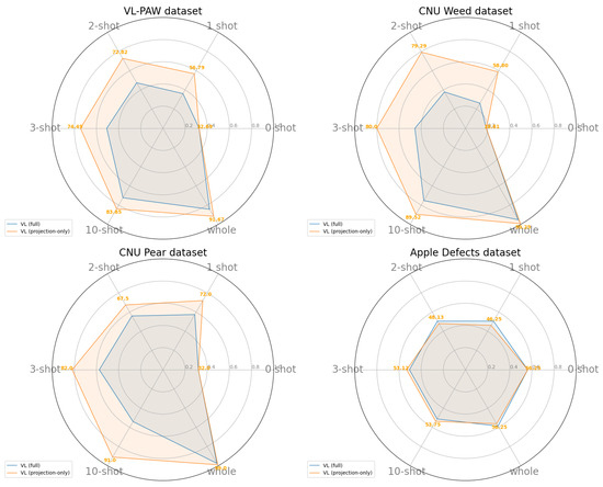 Experiments comparing fine-tuning only the projection head versus fine-tuning the entire model consistently show better performance when fine-tuning only the projection head, across various settings and both in few-shot learning and full-dataset scenarios. A clear trend we observe is that as the number of training samples increases, the performance gap between the two settings narrows, compared to when only 1 to 3 samples are used. This suggests that in few-shot learning, it is advantageous to keep the number of learnable parameters small, preventing the model from overfitting to the limited new data. This trend is particularly clear in the weed and pear datasets, where class-specific features are more distinct. However, the same pattern is dismissed in the Apple Defects Dataset, where the types of defects are very hard to differentiate. This highlights a broader challenge for vision–language models in handling fine-grained distinctions and suggests that further research is needed.