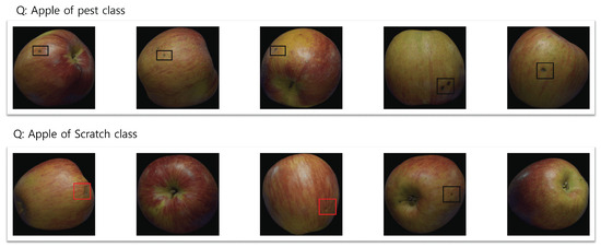Visualization of text-based image retrieval on the apple dataset. The query prompts are composed of defect types of apples. The bounding boxes are only for visualization; the model is unable to pinpoint the defected ares.