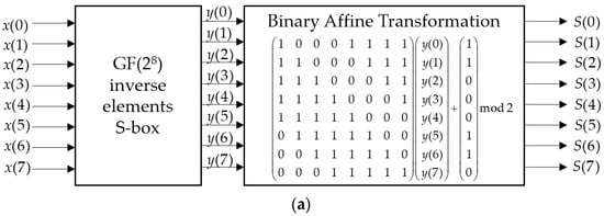where denotes the operation of taking an element by double modulo, and is the primitive irreducible polynomial. For example, in the AES cryptographic algorithm, the type of primitive irreducible polynomial is fixed as , while the specific S-box, which is built on the basis of this primitive irreducible polynomial, is presented in Table 2 [32].