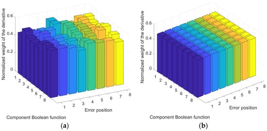 along all directions , where is a linear vector space of vectors of length , and is the operator for evaluation of the Hamming weight. The ideal case, in which all derivatives (5) are balanced, i.e., their Hamming weights are equal to , means that the component Boolean function corresponds to the strict avalanche criterion, i.e., the probability of changing its output when changing the value of any of its inputs is equal to .