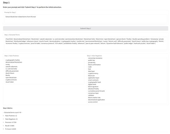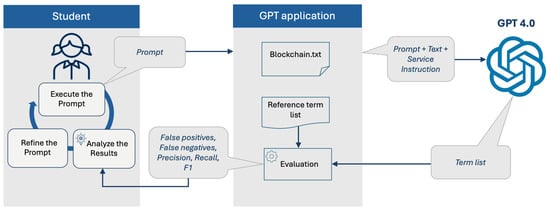 Figure 2 captures the entire three-step refinement loop. At each step, the student submits a prompt, which the application automatically wraps with the service instruction and the blockchain text before forwarding the bundle to GPT-4.0. The model deterministically returns a line-by-line list of candidate terms. The back-end then compares this list with the reference list, calculating precision, recall, and F1-score. These metrics and the extracted term list, which highlights false positives and false negatives, are displayed immediately to the student, who then analyzes the outcome, refines the prompt, and begins the next step.