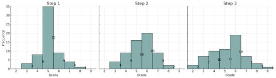In Step 1, the grades are more evenly distributed. In this step, the highest grade is 8 and the lowest is 3, while the F1-score ranges from 44.44 to 70.71. By Step 2, a shift towards higher grades becomes noticeable. Although the highest and lowest grades remain the same (8 and 3, respectively), the highest F1-score increases to 76.47, with the lowest slightly improving to 46.94. In Step 3, the distribution does not show further improvement. The highest grade improves further to 9, while the lowest drops to 2. The highest F1-score reaches an impressive 94.95, but the lowest fell sharply to 14.93.