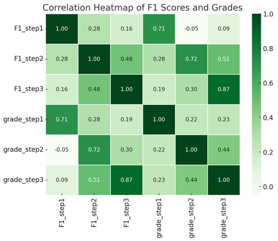 The correlation between teacher-assigned grades and F1-scores is high, measuring 0.71 in Step 1, 0.72 in Step 2, and increasing to 0.87 in Step 3 (see Figure 8). The steadily rising correlation demonstrates that the teacher’s rubric-based grades (6C criteria) increasingly align with ChatGPT’s measured performance (F1-scores). Even though GPT’s overall output quality does not necessarily improve monotonically across steps, the stronger alignment at Step 3 suggests that the aspects the teacher deems important (as reflected in the 6C rubric) become more closely tied to the actual F-measure for the terms extracted by GPT. Hence, these findings support a positive answer to RQ2, indicating that the teacher-assigned evaluations track well with GPT’s performance metrics.